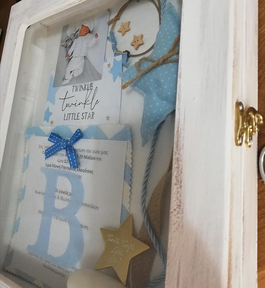 Ξύλινο κουτί με ανοιγόμενο πορτάκι και προστατευτικό τζάμι. Αποτελεί την ιδανική ιδέα φύλαξης των αναμνηστικών της βάπτισης του μωρού μας (φωτογραφία, μαρτυρικά, μπομπονιέρα, προσκλητήριο, παπουτσάκια κλπ). Υπάρχει η δυνατότητα κατασκευής ειδικών διαστάσεων κατόπιν συνεννόησης
