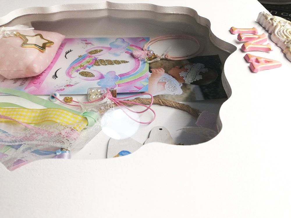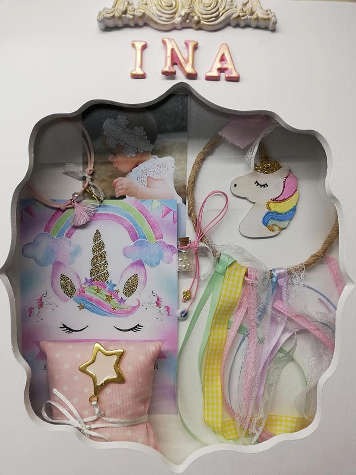 Ξύλινο κουτί με ανοιγόμενο πορτάκι και προστατευτικό τζάμι. Αποτελεί την ιδανική ιδέα φύλαξης των αναμνηστικών της βάπτισης του μωρού μας (φωτογραφία, μαρτυρικά, μπομπονιέρα, προσκλητήριο, παπουτσάκια κλπ). Υπάρχει η δυνατότητα κατασκευής ειδικών διαστάσεων κατόπιν συνεννόησης