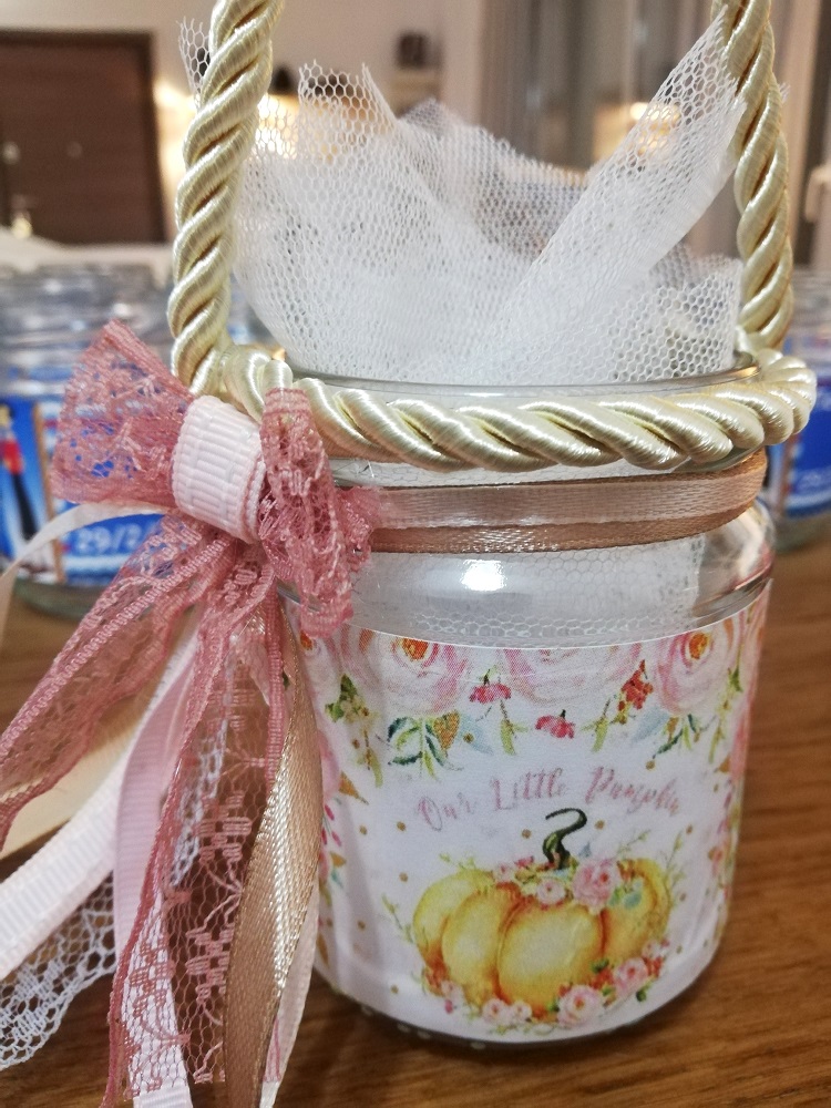 Βαζάκι 8εκ με θεματικό αυτοκόλλητο που προσαρμόζεται σε κάθε θέμα. Ένα γλυκο κηροπήγιο που θα εντυπωσιάσει τυς καλεσμένους σας. Συνοδεύεται από 3 κουφέτα crispy Χατζηγιαννάκη.