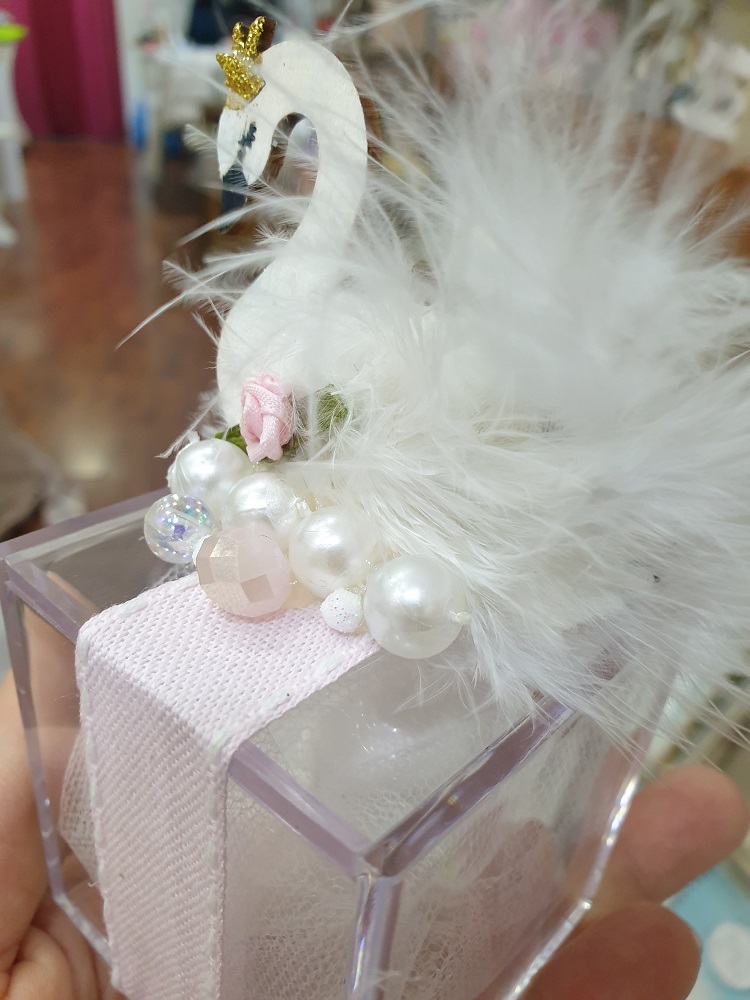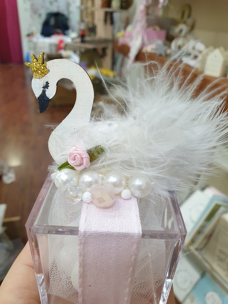 Plexiglas κουτί 6*6*6 cm με ξύλινο κύκνο και ρομαντική διακόσμηση. Συνοδεύεται από 5 κουφέτα Χατζηγιαννάκη.