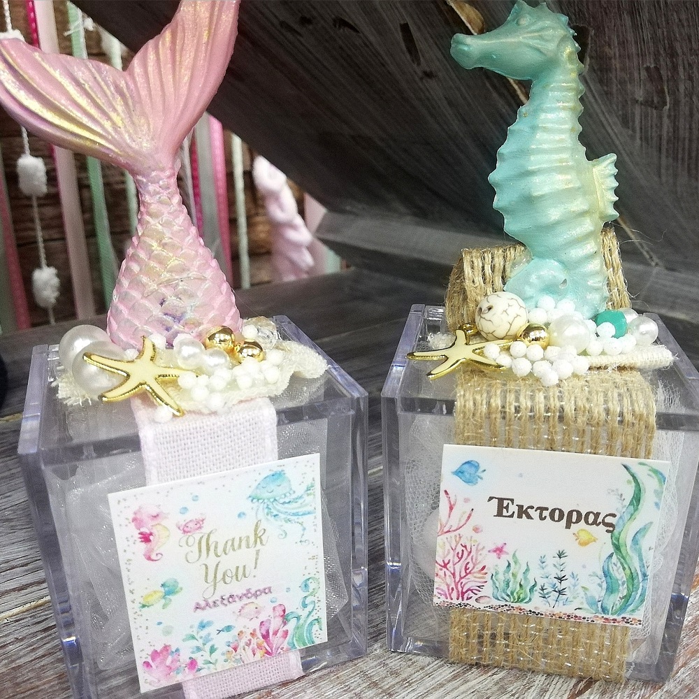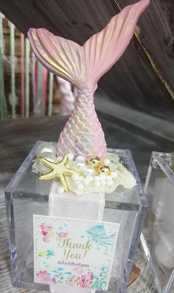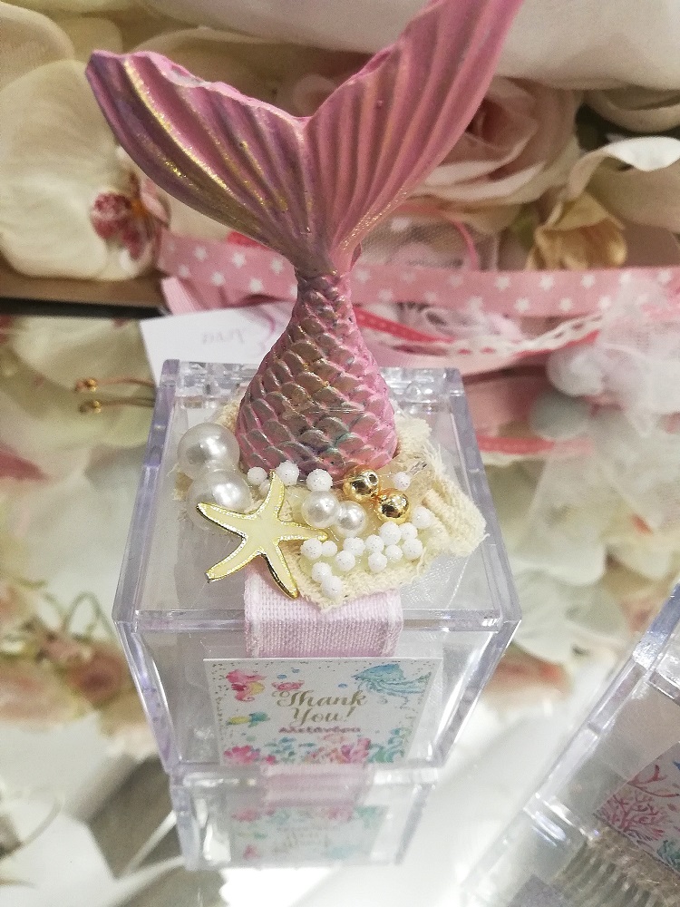 Plexiglas κουτί 6*6*6 cm με καλοκαιρινή διακόσμηση γύψινων στοιχείων ουρά γοργόνας. Συνοδεύεται από 5 κουφέτα Χατζηγιαννάκη