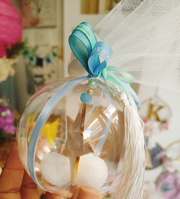 Μπάλα pvc διαμέτρου 10εκ με αστέρι καθρέφτη plexiglass, πομ πον, φουντάκι εξωτερικά και κορδέλες. Συνοδεύεται από 3 κουφέτα crispy Χατζηγιαννάκη.