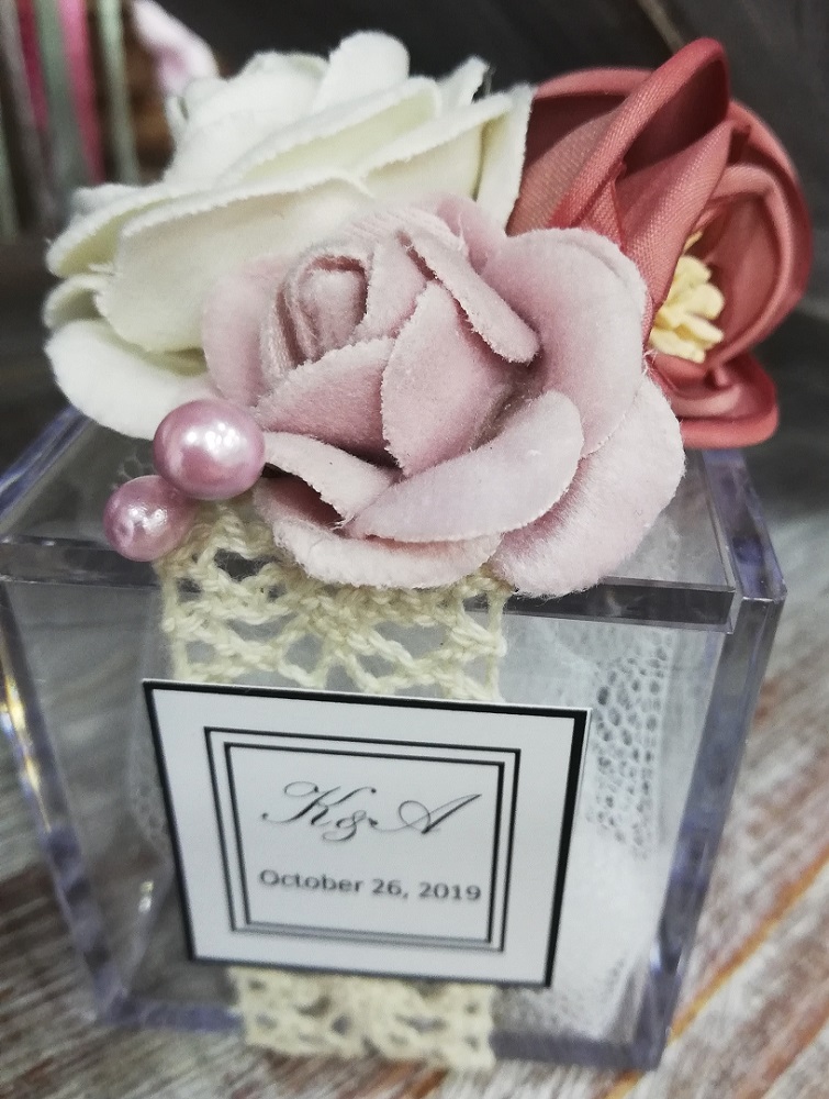Plexiglas κουτί 6*6*6 cm με ρομαντική floral διακόσμηση, δαντέλα και καρτελάκι.