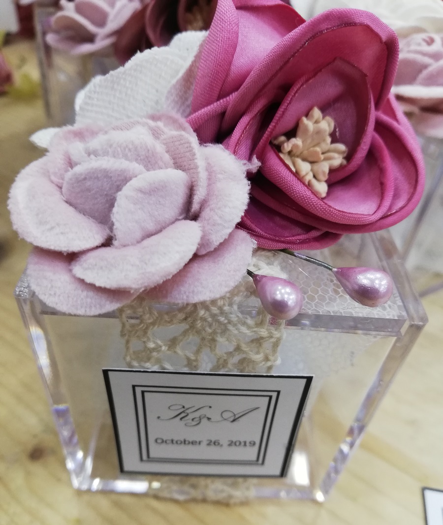 Plexiglas κουτί 6*6*6 cm με ρομαντική floral διακόσμηση, δαντέλα και καρτελάκι.