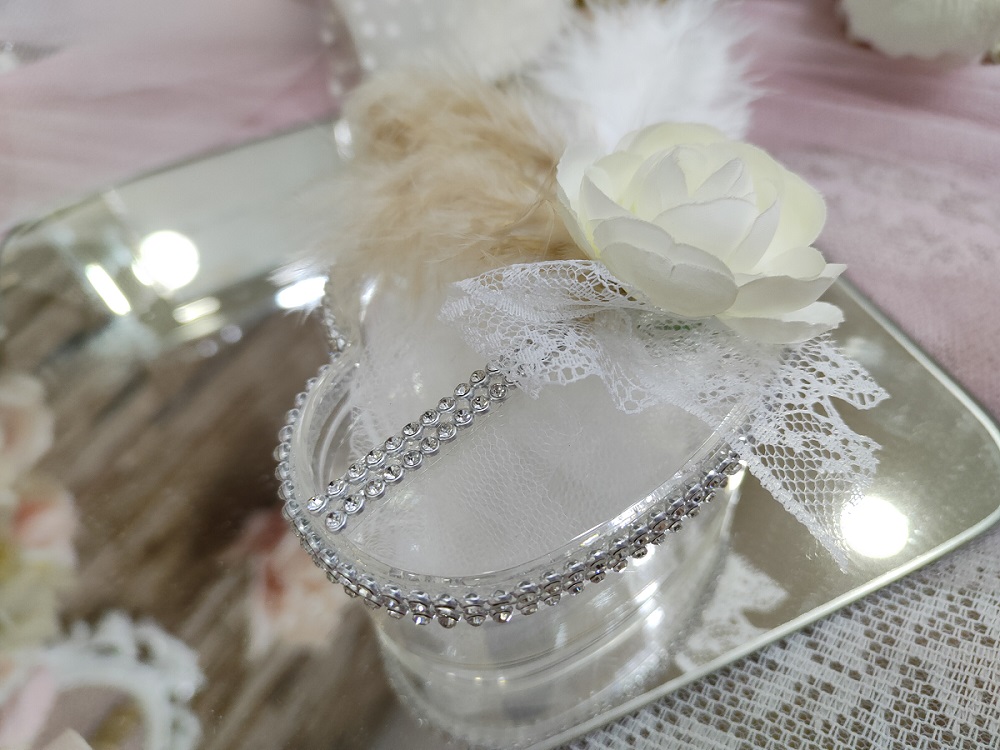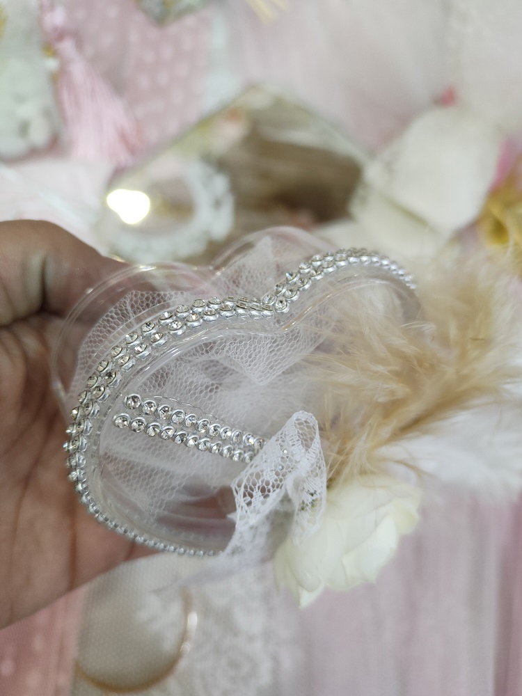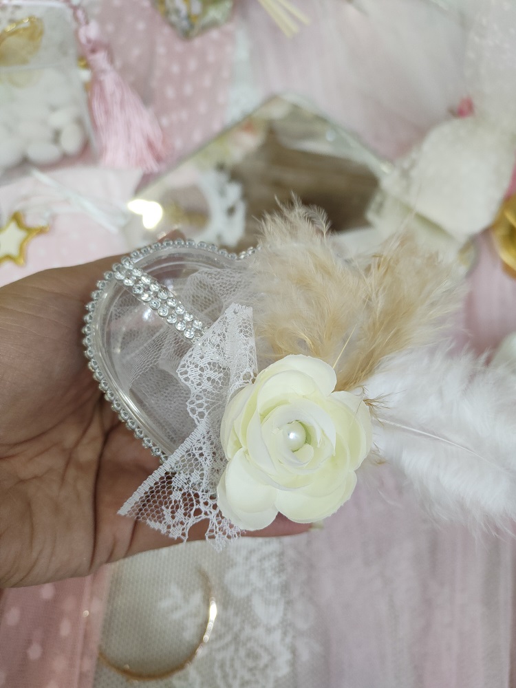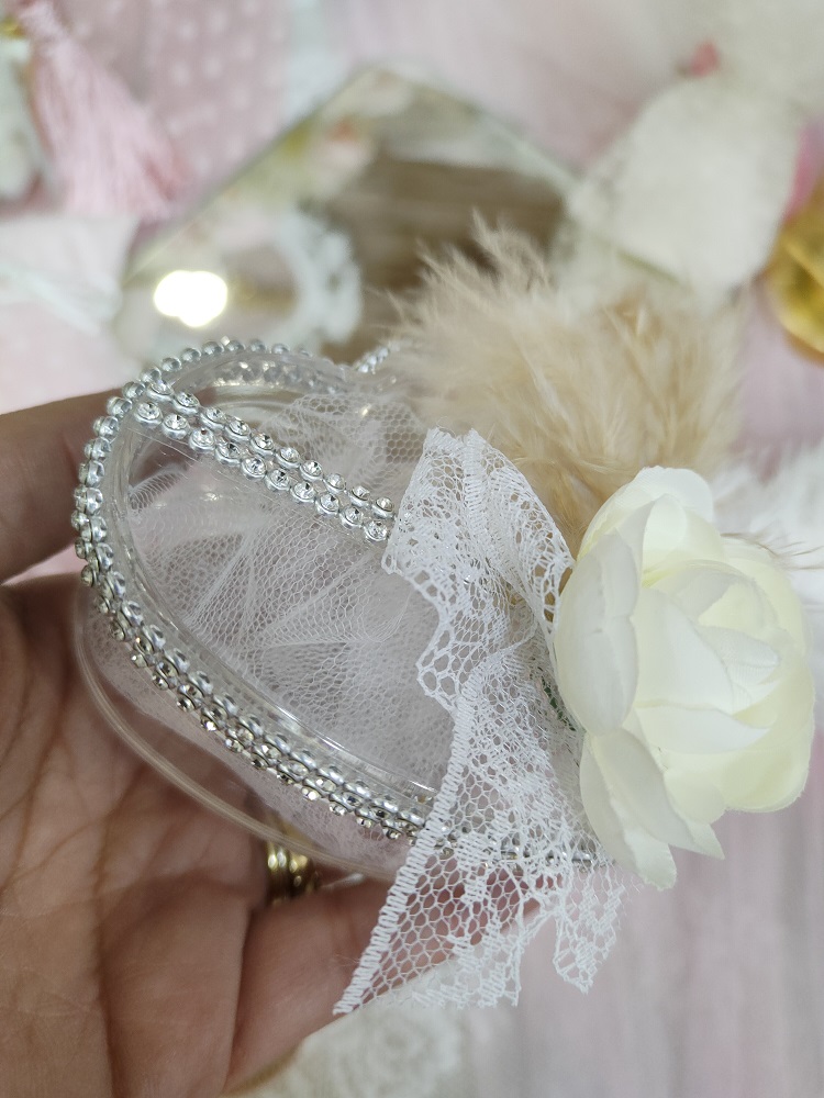Plexiglas κουτί σε σχήμα καρδιάς και πολυτελή, ρομαντική floral διακόσμηση με φτερά, δαντέλα και στρας λεπτομέρειες.
