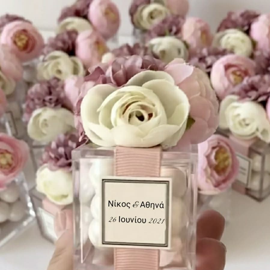 Plexiglas κουτί 6*6*6 cm με ρομαντική floral διακόσμηση, δαντέλα και καρτελάκι.