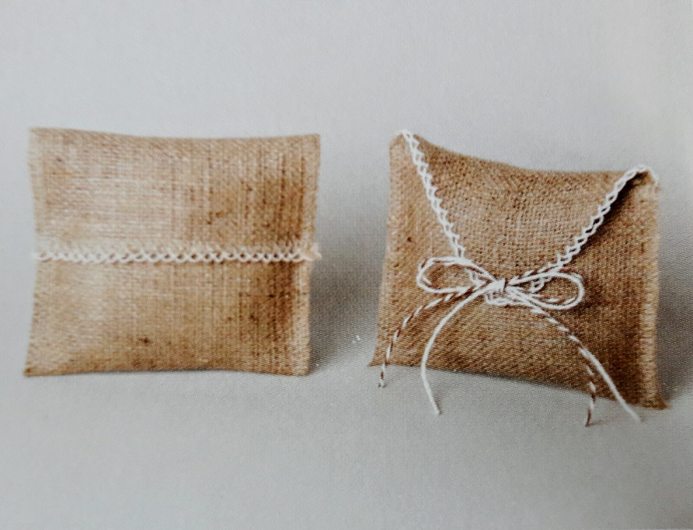 Φάκελος από λινάτσα με λεπτομέρειες από γαζί λευκό. Κλείνει με λευκό φιόγκο και συνοδεύεται από 5 κουφέτα Χατζηγιαννάκη.