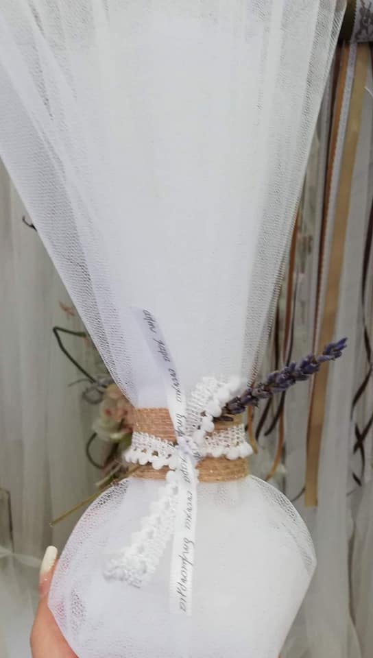 Τούλινη μπομπονιέρα με δέσιμο λινάτσα, φυσική λεβάντα και δαντέλα.
