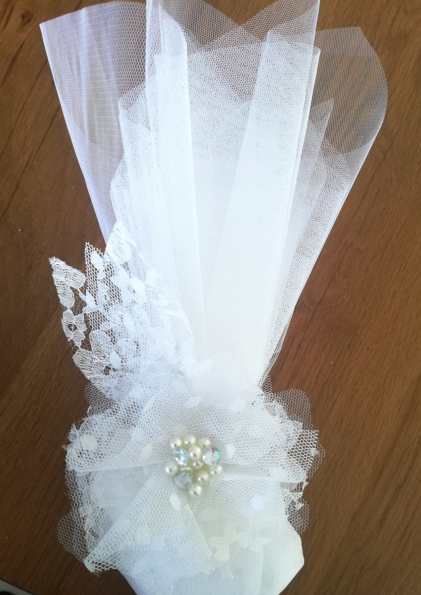 Τούλινη μπομπονιέρα με χειροποίητη πολυτελή floral δισκόσμηση.