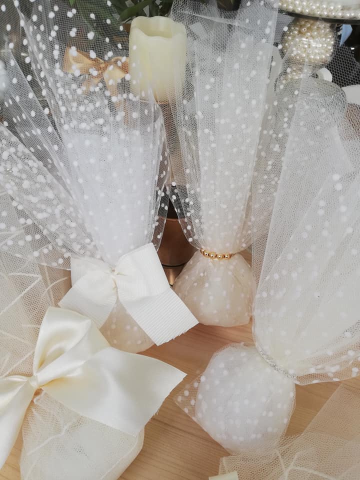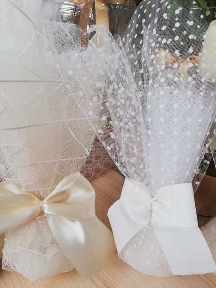 Τούλινη μπομπονιέρα με εξωτερικό πουά τούλι και δέσιμο με χοντρή κορδέλα 2,5 εκ.