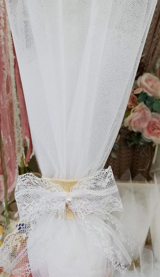 Τούλινη μπομπονιέρα με δέσιμο από χρυσό ταφτά και δαντέλα.