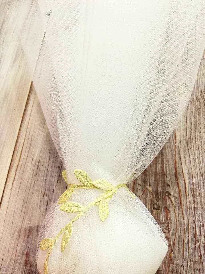 Τούλινη μπομπονιέρα με δέσιμο από χρυσό μοτίφ κλαδί ελιάς.
