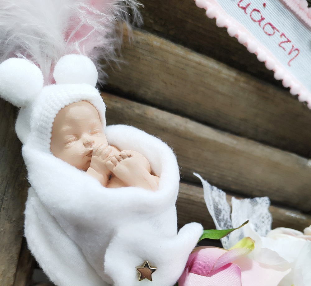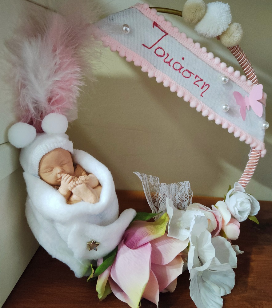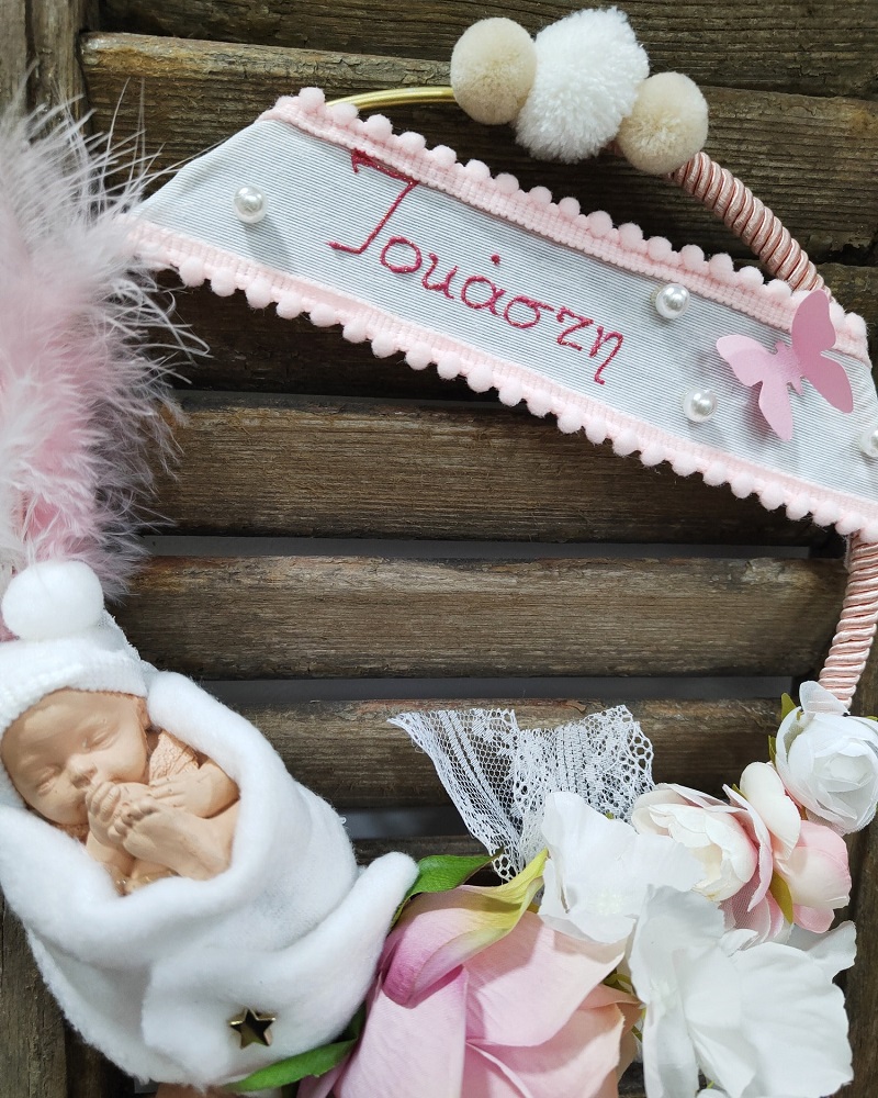 Διακοσμητικό μεταλλικό στεφάνι διαμέτρου 25εκ με γύψινο νεογέννητο μωράκι , διακόσμηση λουλουδιών και όνομα.