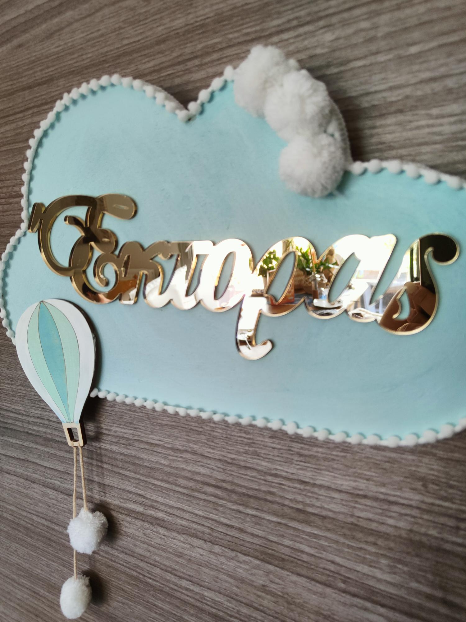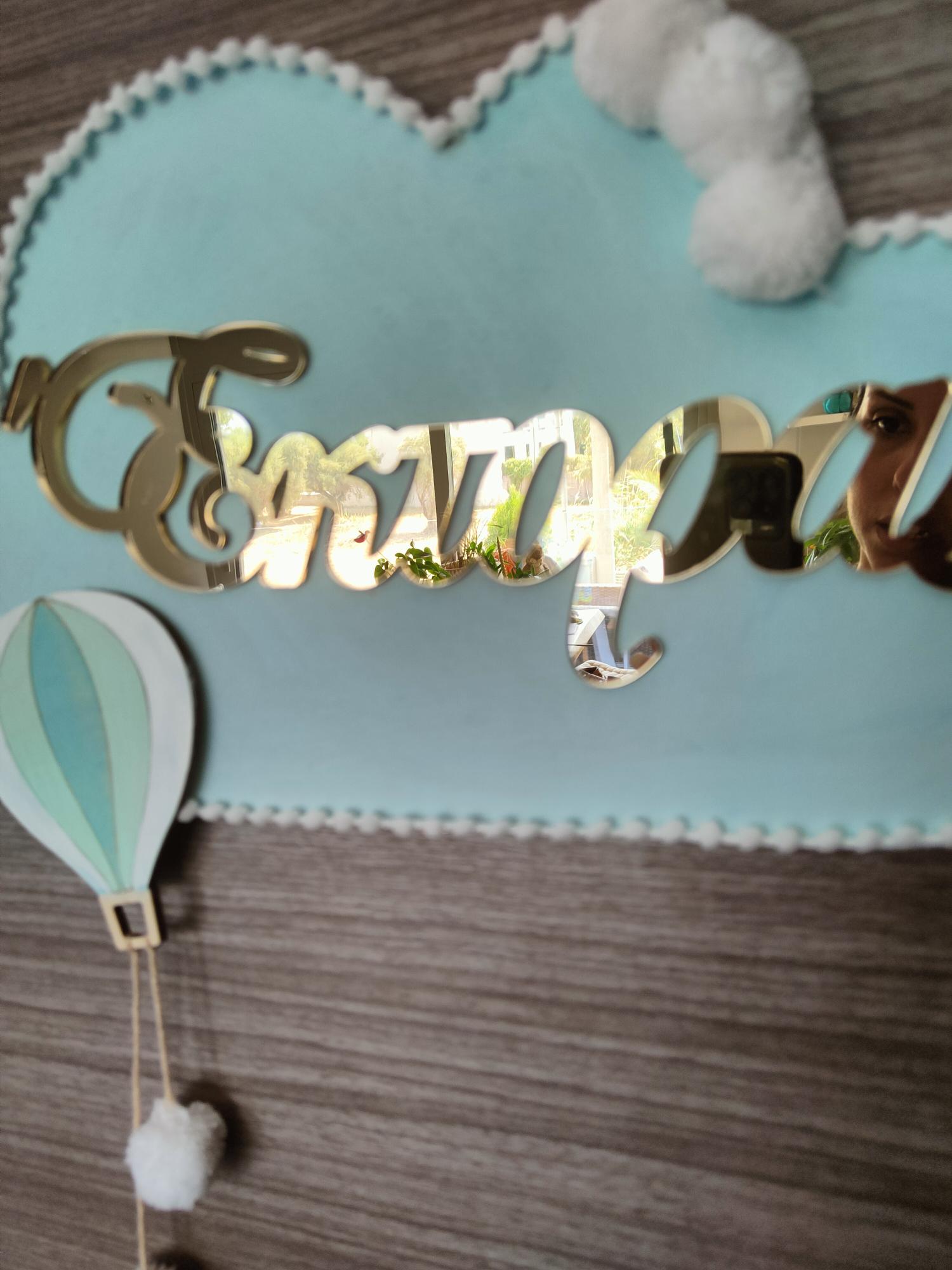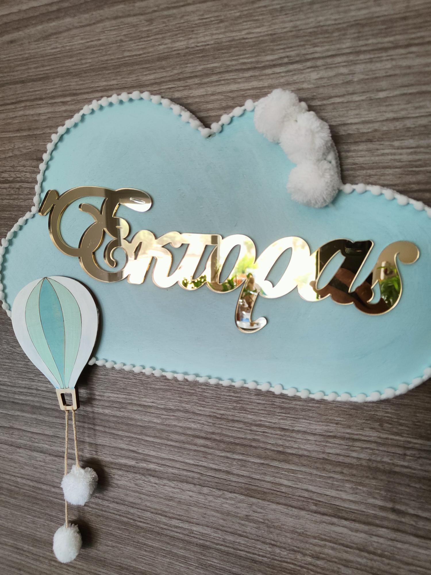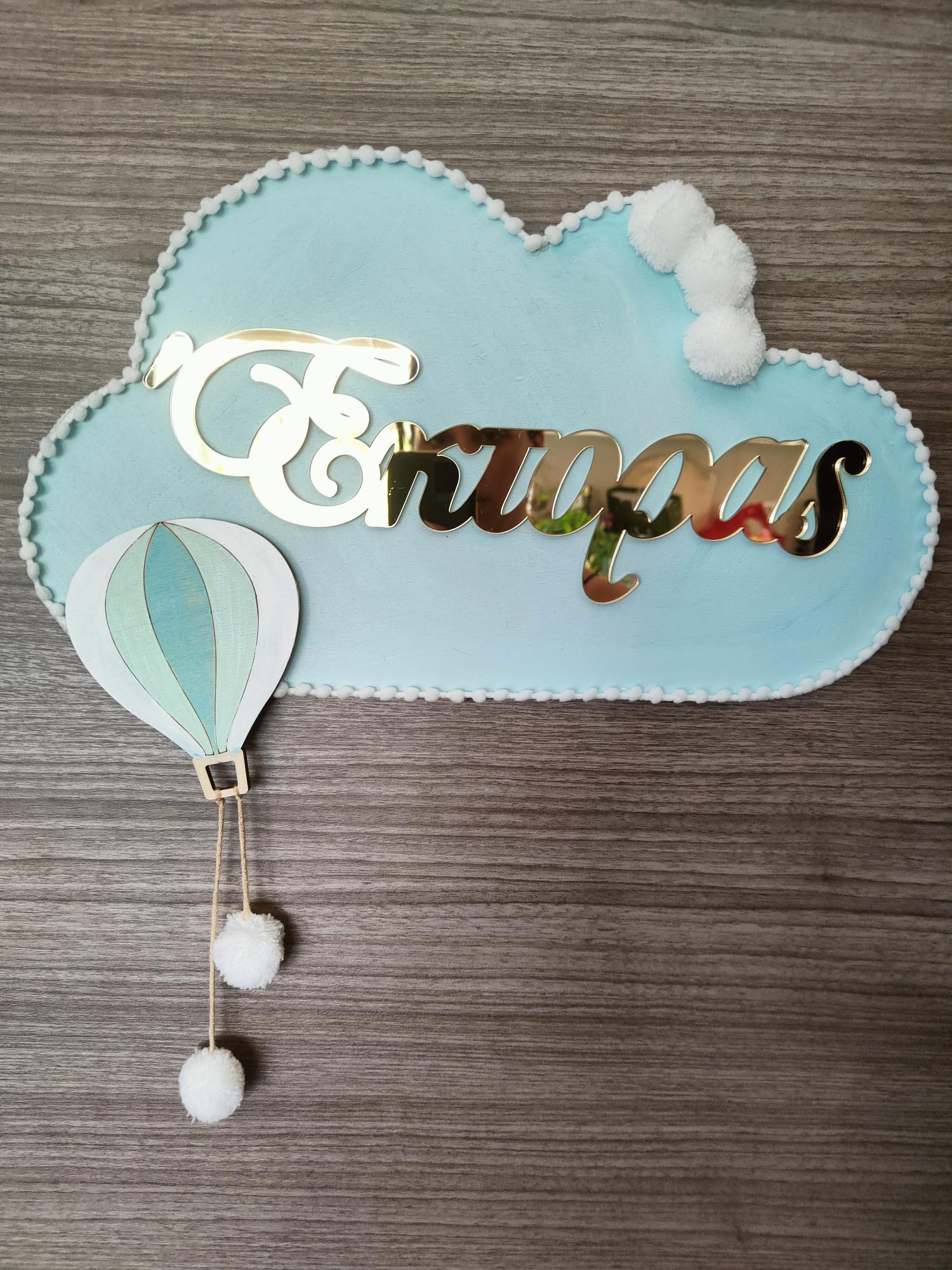 Ξύλινο συννεφάκι lasercut διάστασης 40 εκ. διακοσμημένο με ξύλινο αερόστατο και όνομα plexiglass χρυσό ή ασημί καθρέπτη.