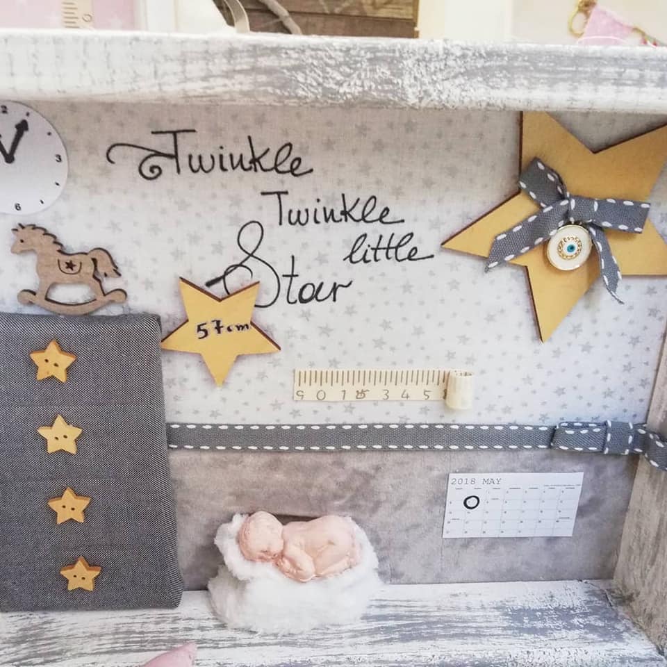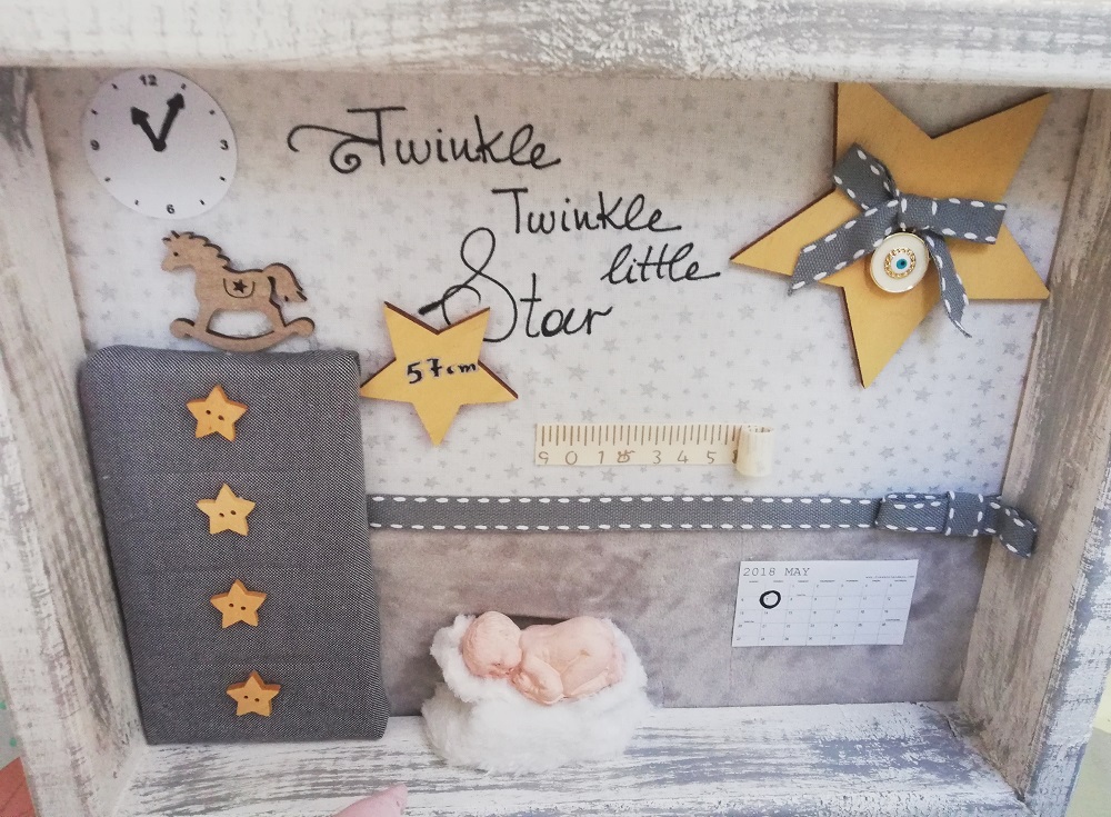Τρισδιάστατο καδράκι Shadowbox από μασίφ ξύλο και χειροποίητα διακοσμητικά. Περιέχει ημερομηνία & ώρα γέννησης, βάρος, ύψος και αν θέλετε όνομα.