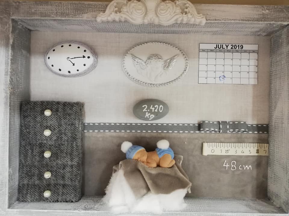 Τρισδιάστατο καδράκι Shadowbox από μασίφ ξύλο και χειροποίητα διακοσμητικά. Περιέχει ημερομηνία & ώρα γέννησης, βάρος, ύψος και αν θέλετε όνομα.