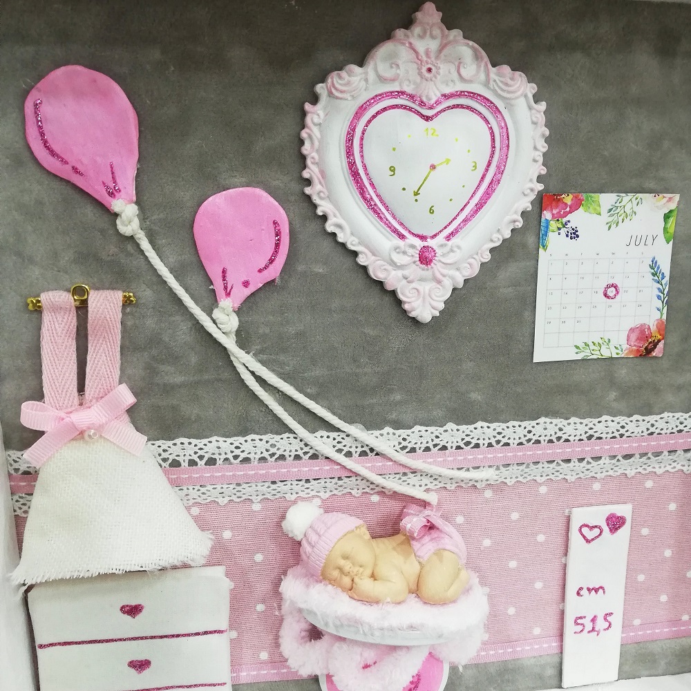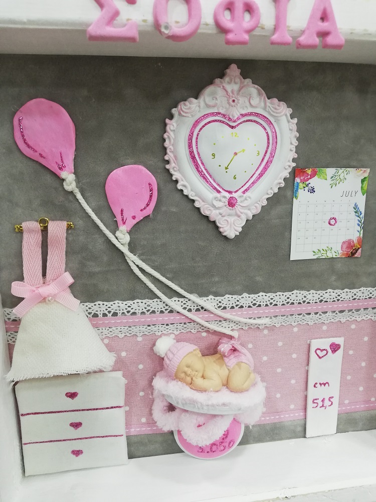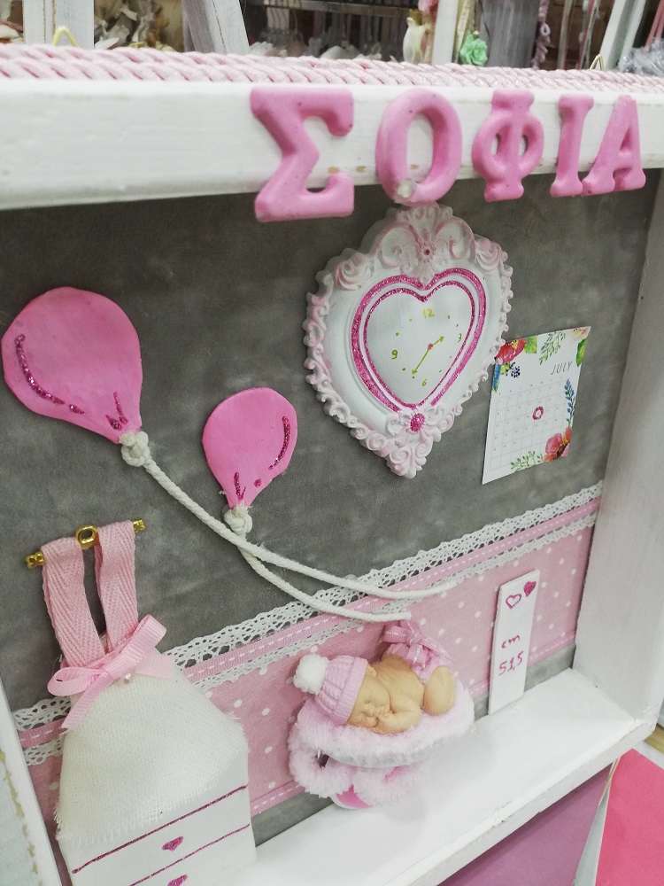 Τρισδιάστατο καδράκι Shadowbox από μασίφ ξύλο και χειροποίητα διακοσμητικά. Περιέχει ημερομηνία & ώρα γέννησης, βάρος, ύψος και αν θέλετε όνομα.