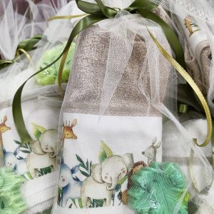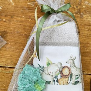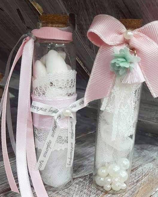 Γυάλινος σωλήνας με καπάκι φελλό και ρομαντική διακόσμηση. Συνοδεύεται από 5 κουφέτα Χατζηγιαννάκη.