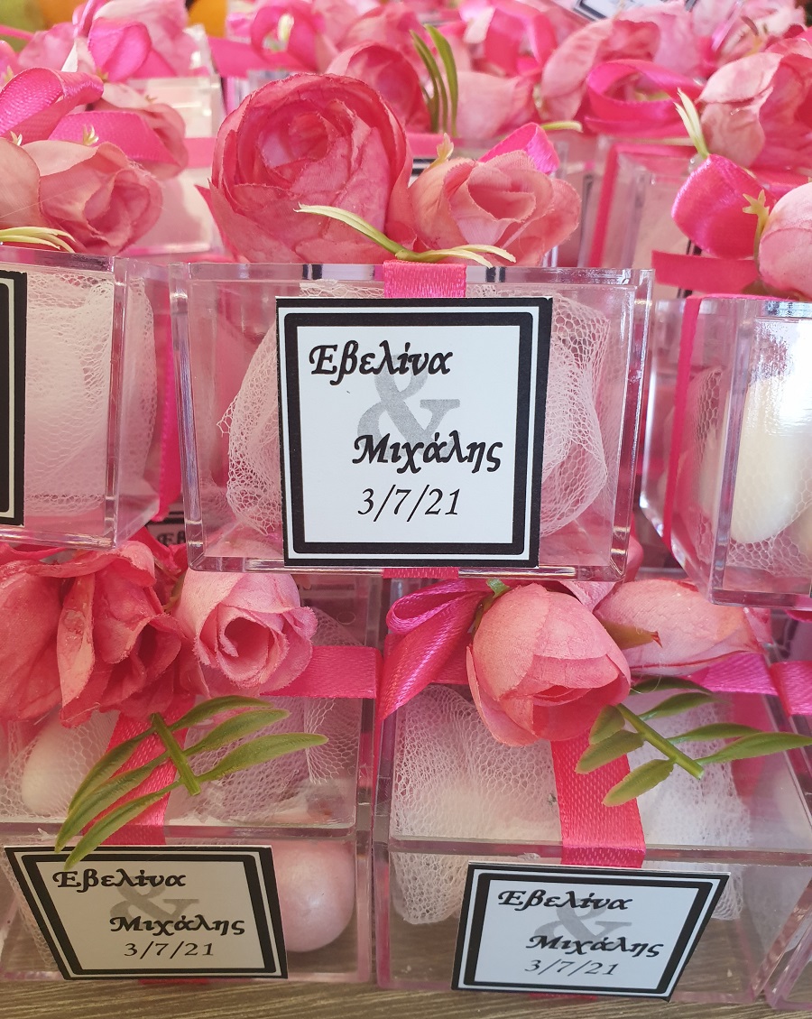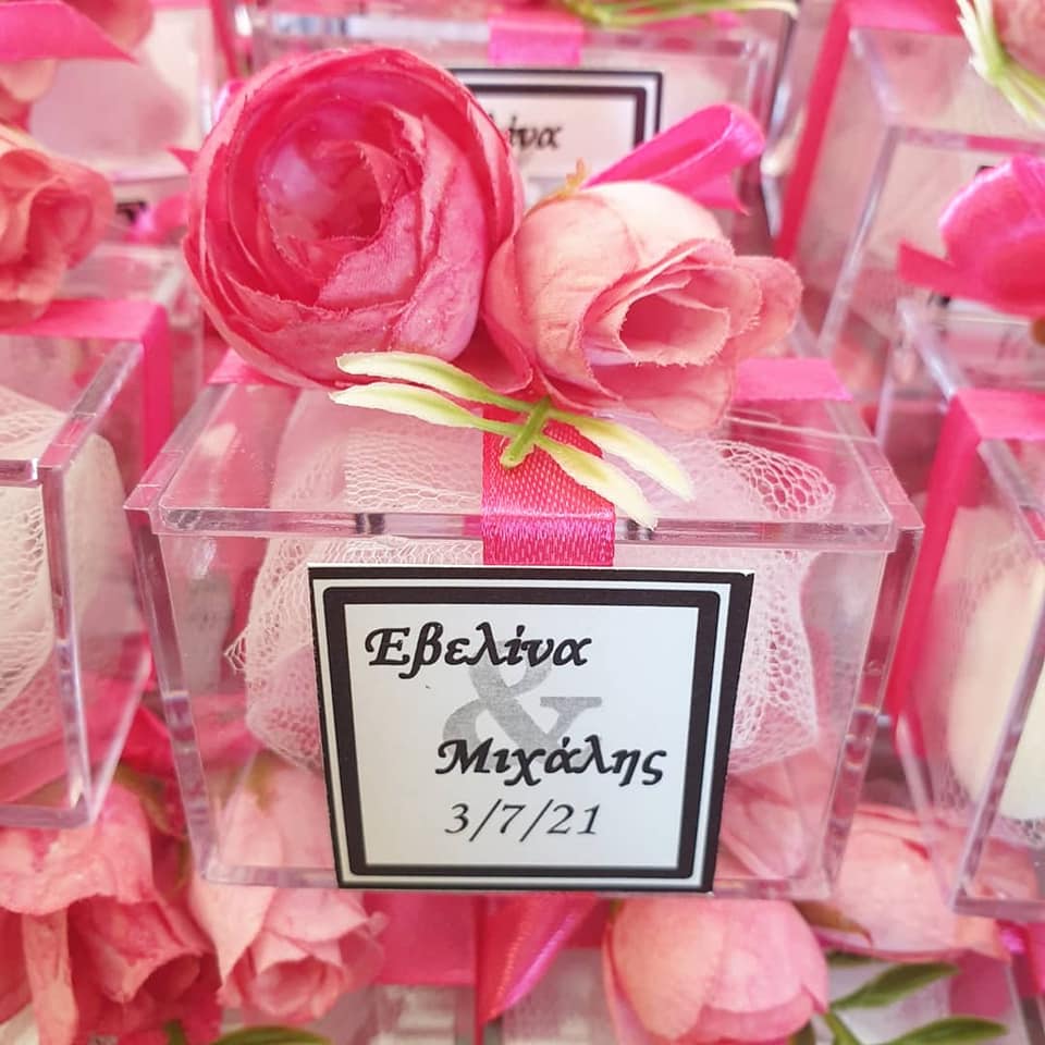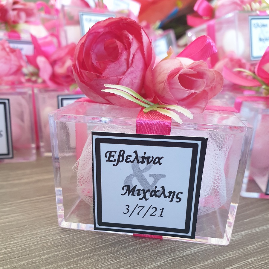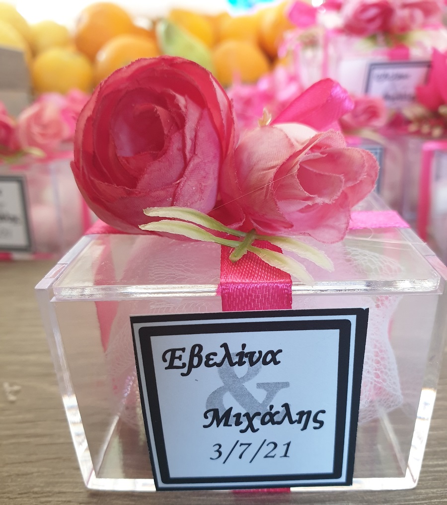 Plexiglas κουτί 6*6*6 cm με ρομαντική, μοντέρνα, floral διακόσμηση και καρτελάκι σε minimal γραμμές.