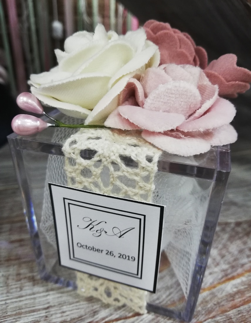 Plexiglas κουτί 6*6*6εκ. με ρομαντική floral διακόσμηση, δαντέλα και καρτελάκι.