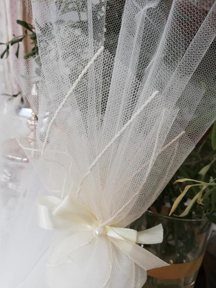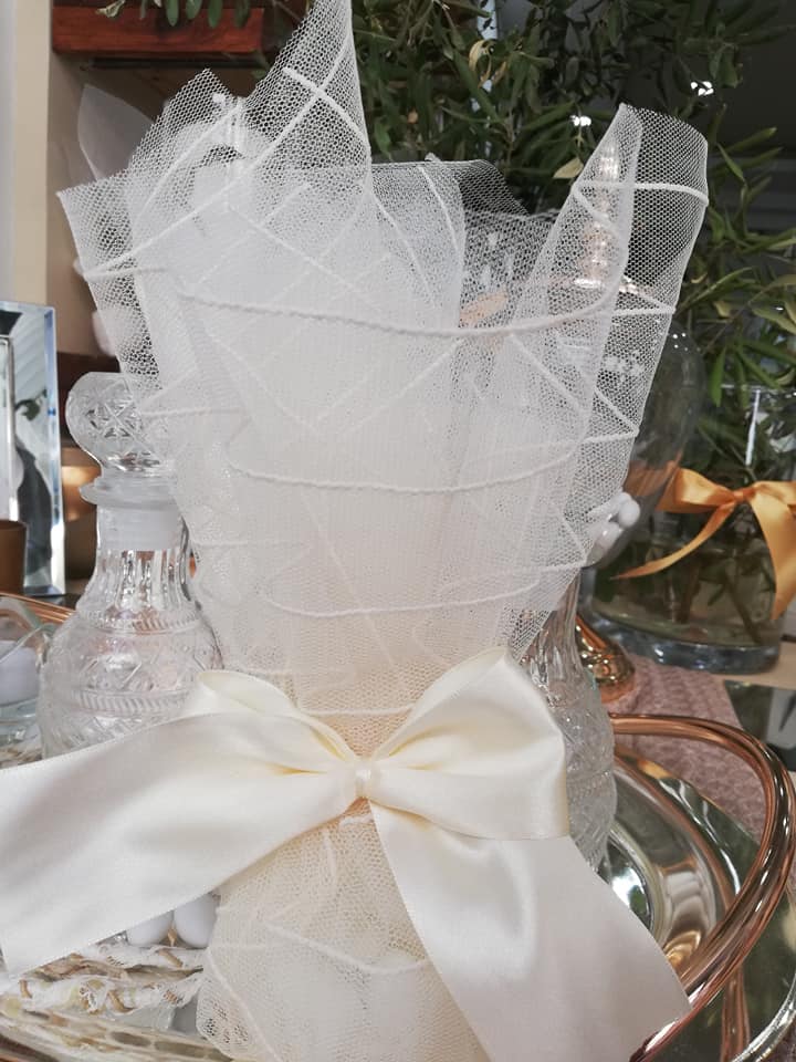 Τούλινη μπομπονιέρα με εξωτερικό καρό τούλι και δέσιμο με χοντρή κορδέλα 2,5 εκ.