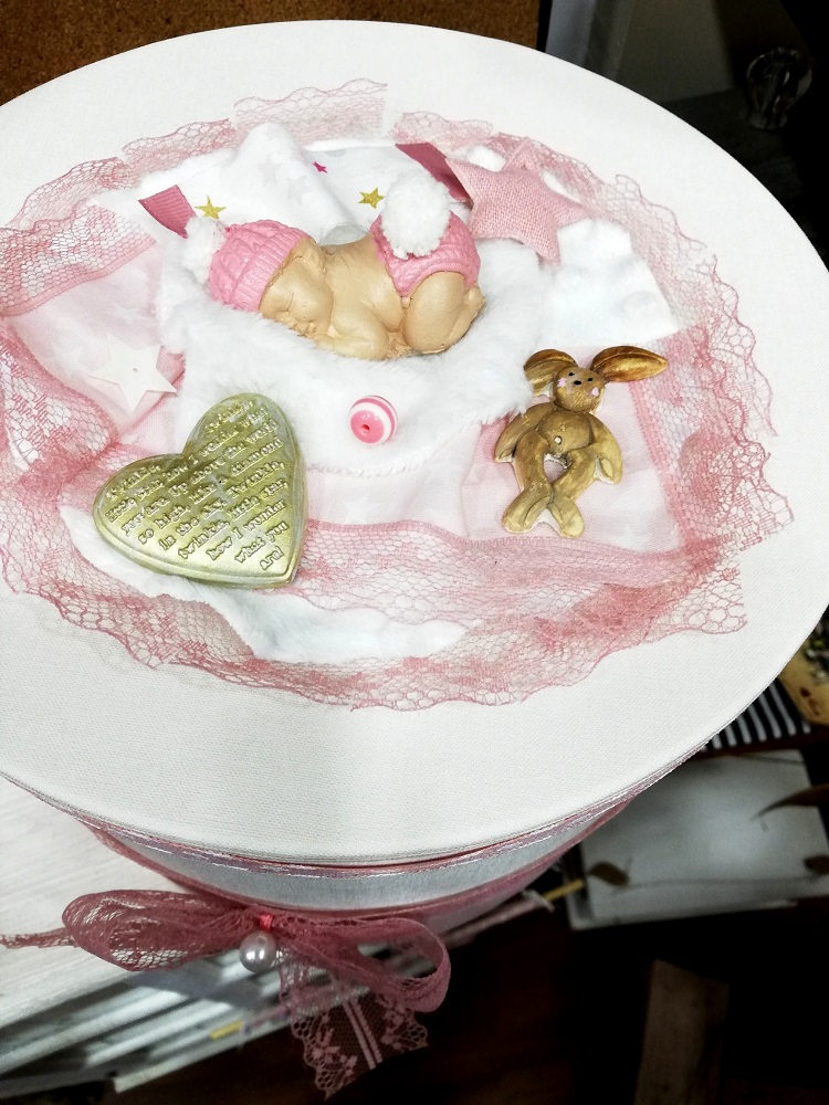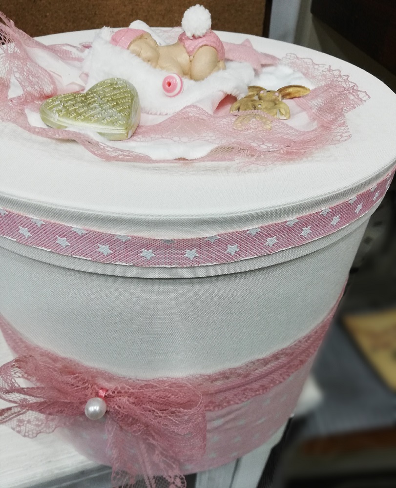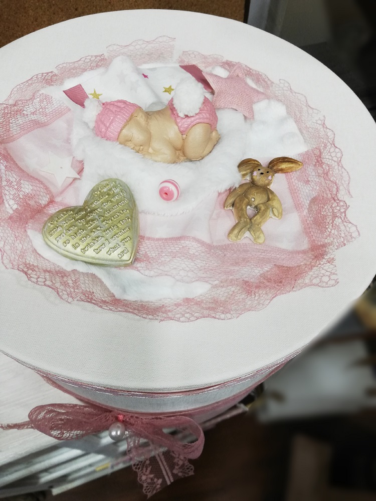 Κουτί σε σχήμα καπελιέρας με υφασμάτινη επένδυση. Το καπάκι διακοσμείται με παιδική χειροποίητη παράσταση sleeping baby και λεπτομέρειες παιδικού δωματίου. Μια ξεχωριστή ιδέα αποθήκευσης αναμνηστικών γέννησης, βάπτισης, πρώτον δώρων ή ακόμα και χρηστικών καθημερινών ειδών με τον πιο κομψό τρόπο.