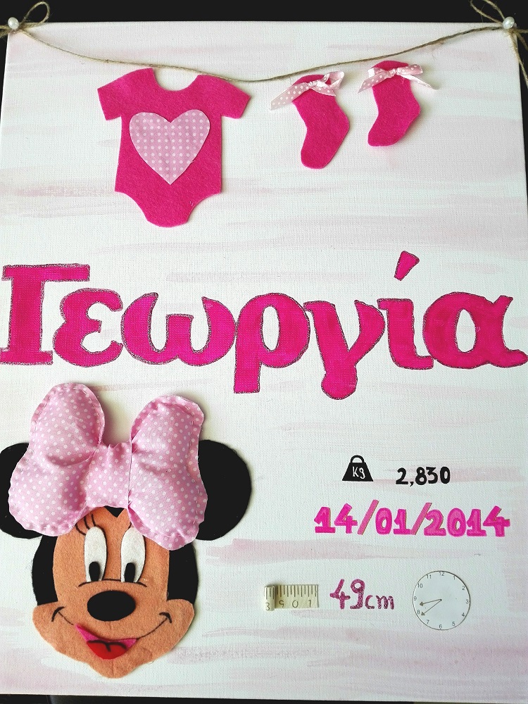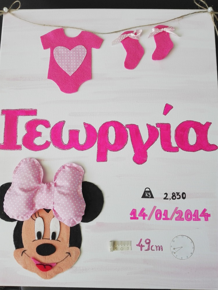 Χειροποίητο καδράκι με πολλαπλές τεχνικές για το παιδικό δωμάτιο. Περιέχει όνομα και στοιχεία γέννησης/βάπτισης. Διαστάσεις 35*45 εκ.
