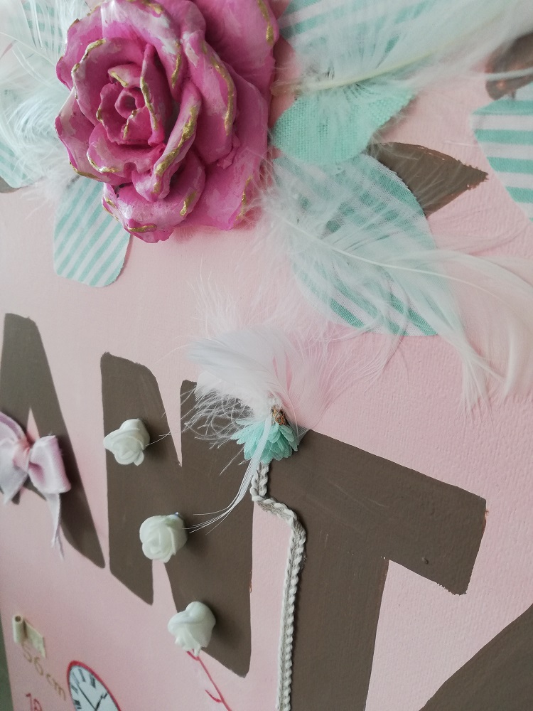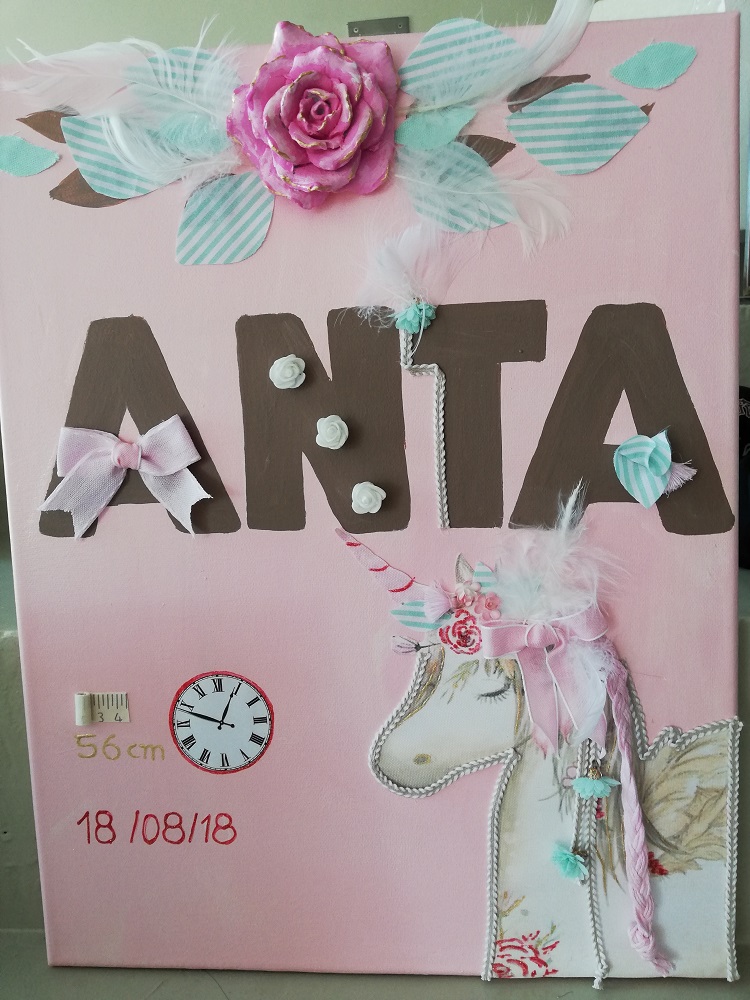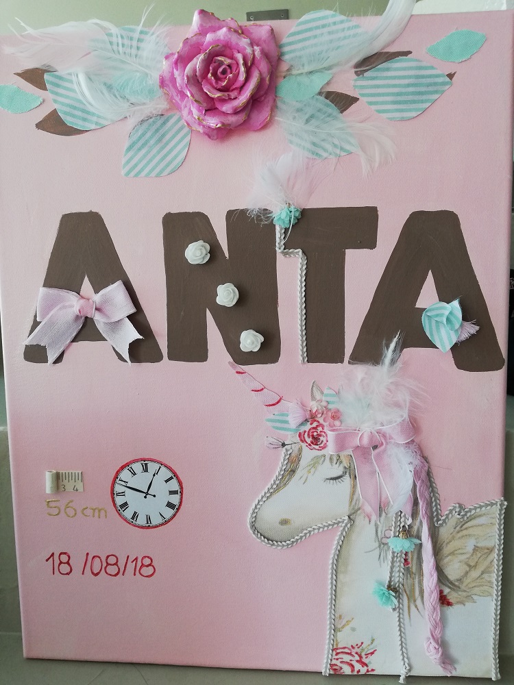 Χειροποίητο καδράκι με πολλαπλές τεχνικές για το παιδικό δωμάτιο. Περιέχει όνομα και στοιχεία γέννησης/βάπτισης. Διαστάσεις 35*45 εκ.