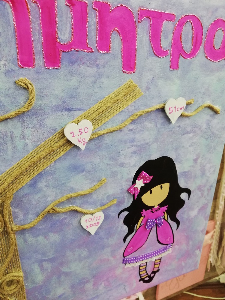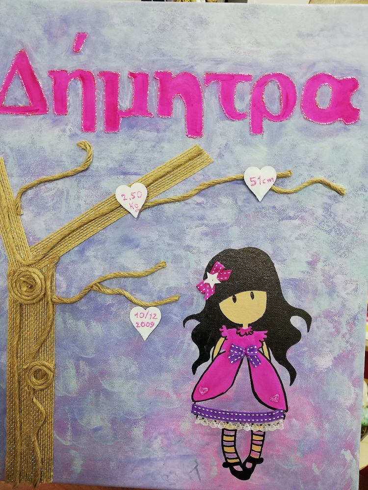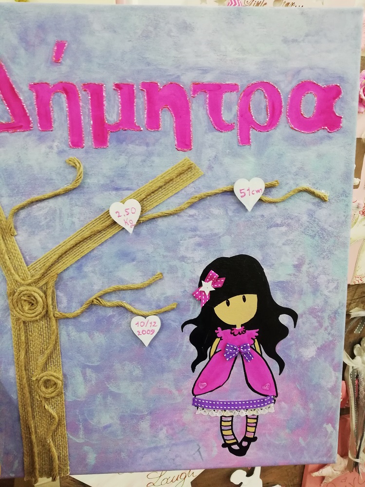 Χειροποίητο καδράκι με πολλαπλές τεχνικές για το παιδικό δωμάτιο. Περιέχει όνομα και στοιχεία γέννησης/βάπτισης. Διαστάσεις 35*45 εκ.