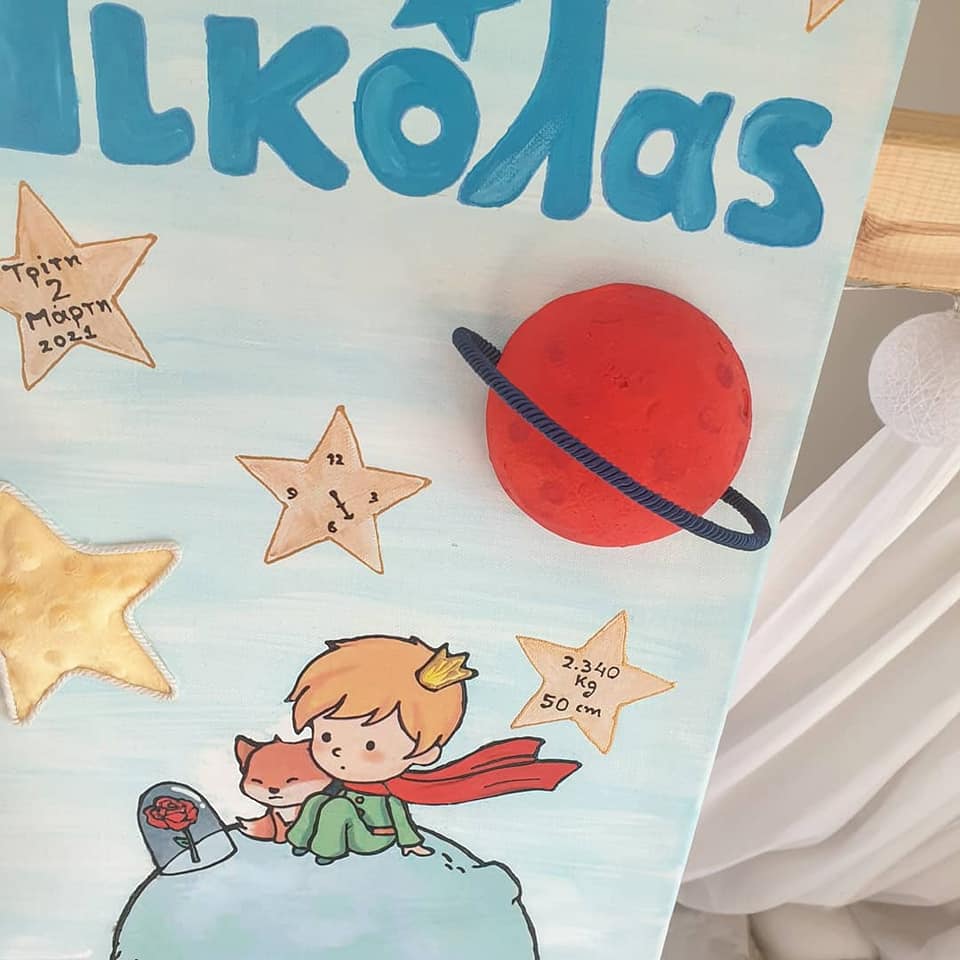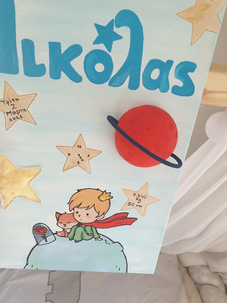 Χειροποίητο καδράκι με πολλαπλές τεχνικές για το παιδικό δωμάτιο. Περιέχει όνομα και στοιχεία γέννησης/βάπτισης. Διαστάσεις 35*45 εκ.
