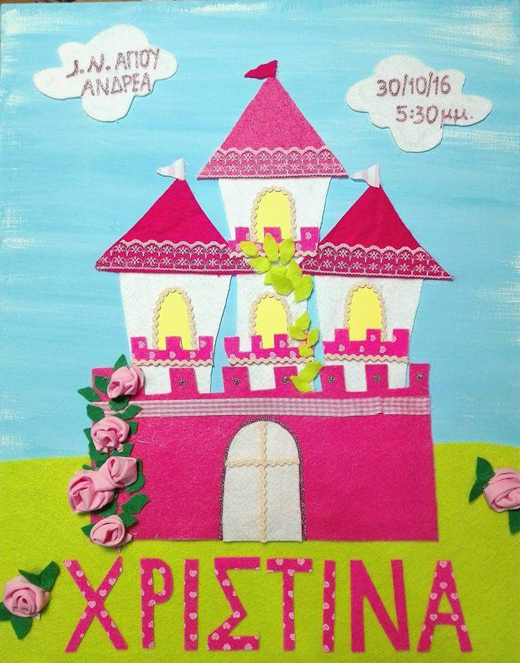 Χειροποίητο καδράκι με πολλαπλές τεχνικές για το παιδικό δωμάτιο. Περιέχει όνομα και στοιχεία γέννησης/βάπτισης. Διαστάσεις 35*45 εκ.