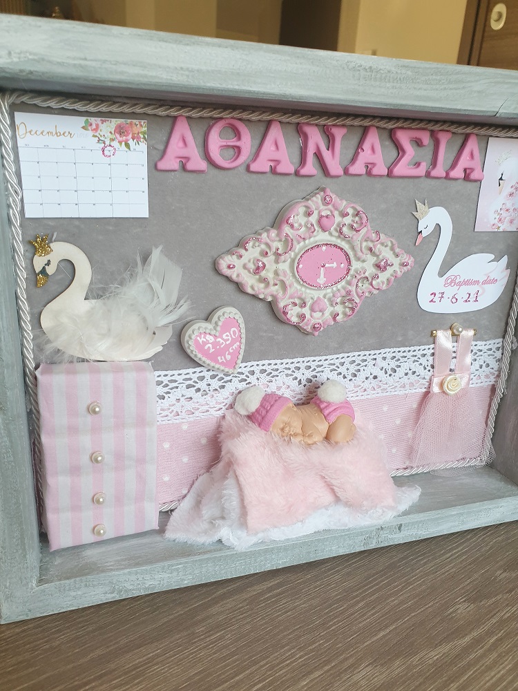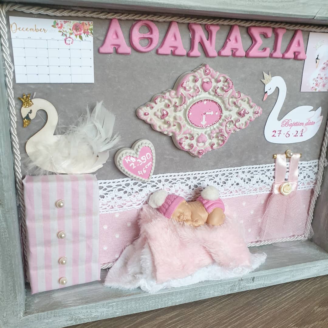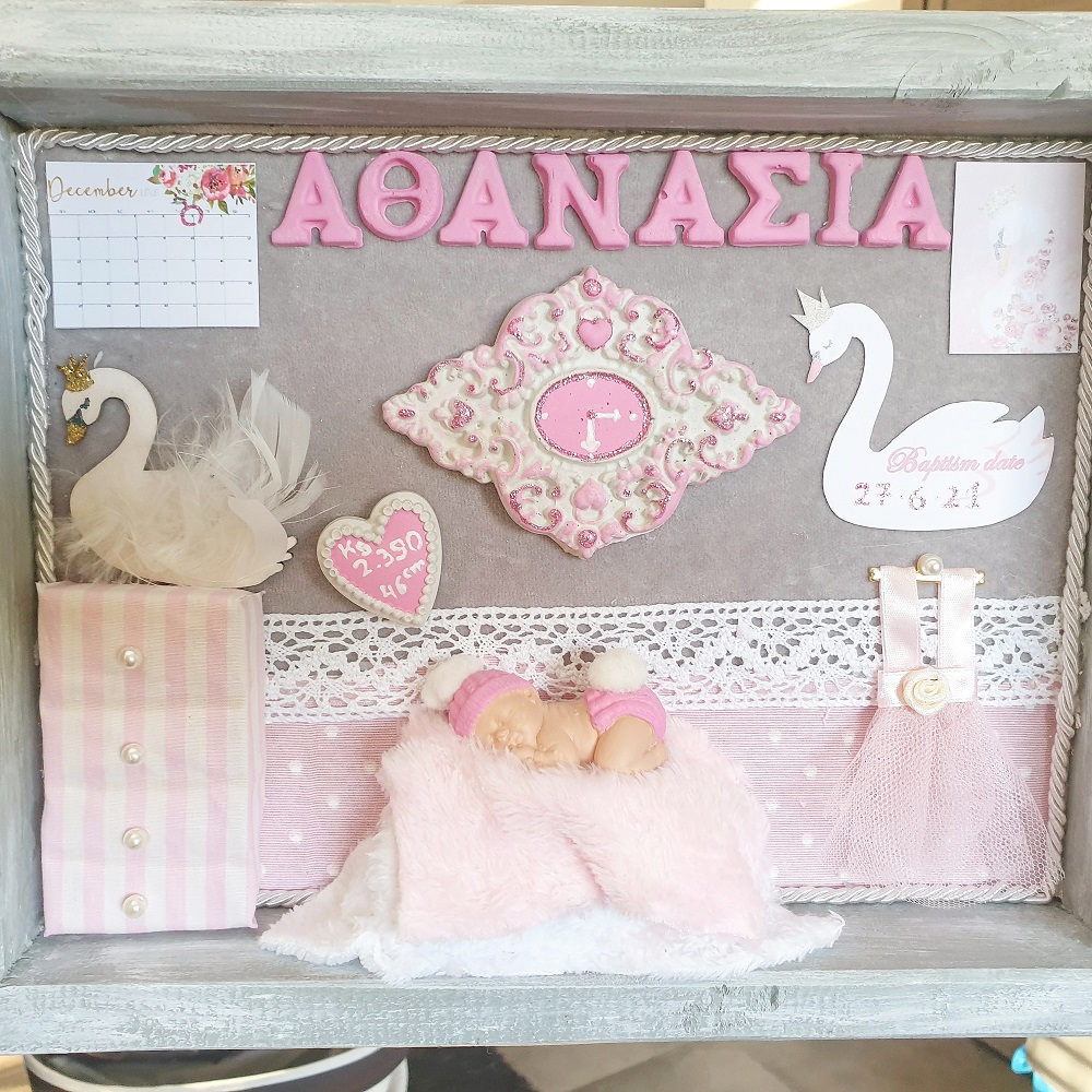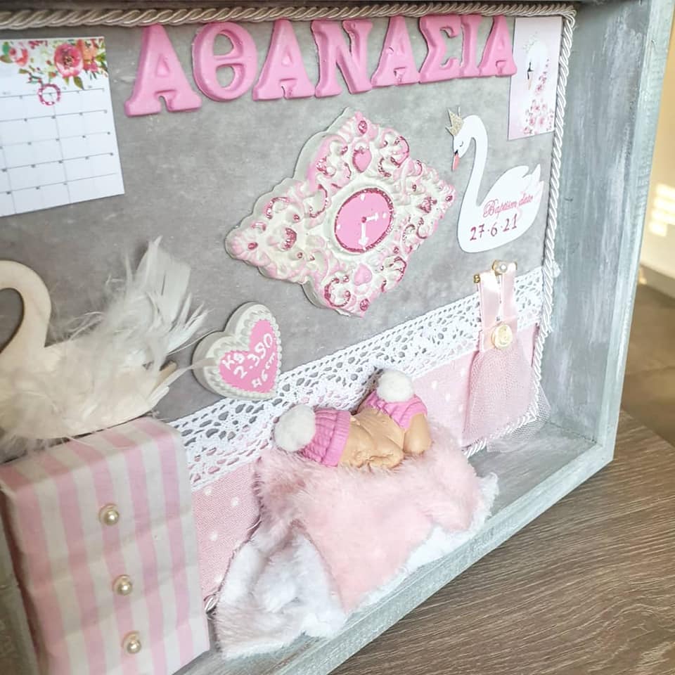 Τρισδιάστατο καδράκι Shadowbox από μασίφ ξύλο και χειροποίητα διακοσμητικά. Περιέχει ημερομηνία & ώρα γέννησης, βάρος, ύψος και αν θέλετε όνομα.