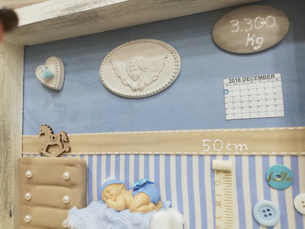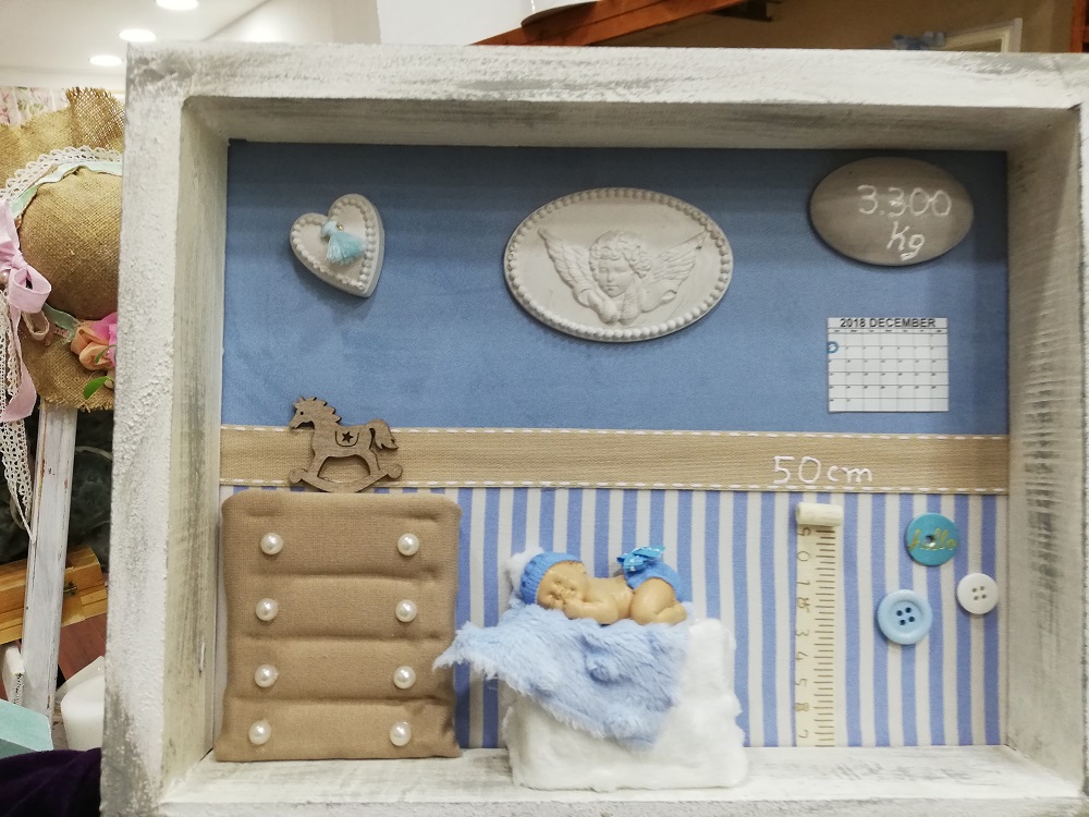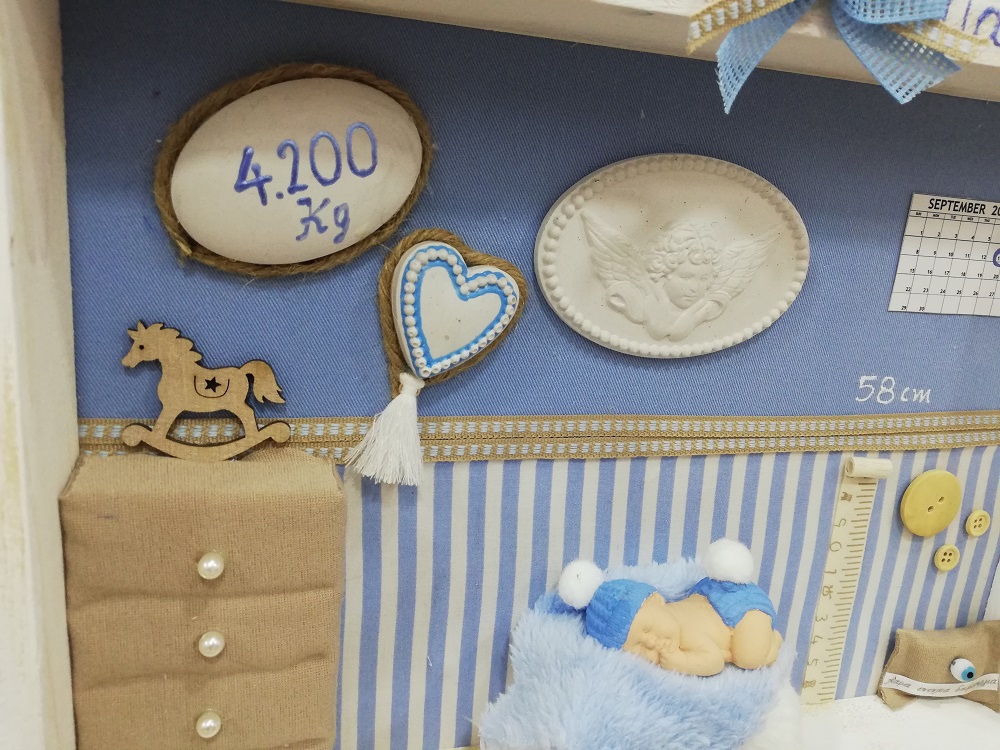 Τρισδιάστατο καδράκι Shadowbox από μασίφ ξύλο και χειροποίητα διακοσμητικά. Περιέχει ημερομηνία & ώρα γέννησης, βάρος, ύψος και αν θέλετε όνομα.